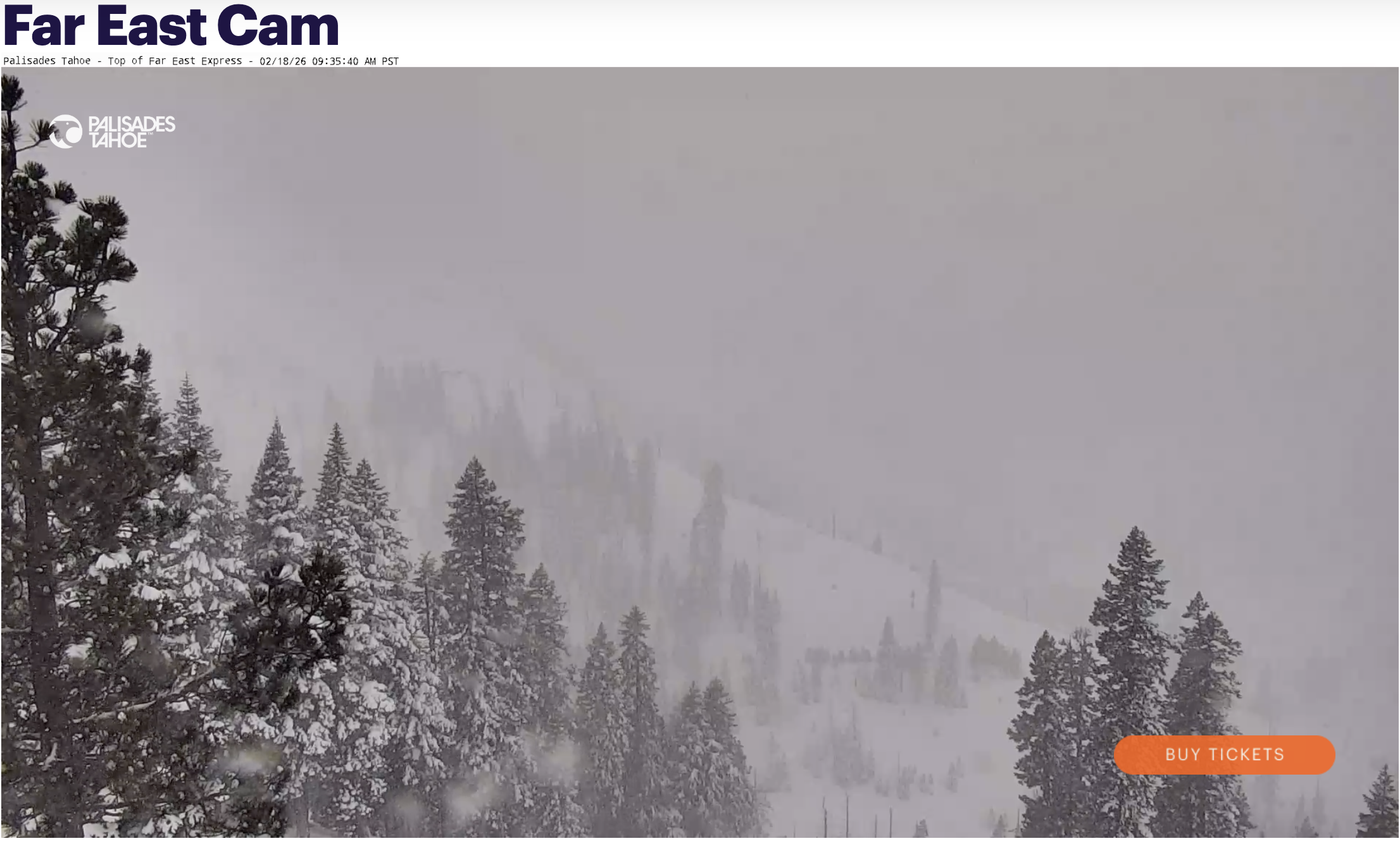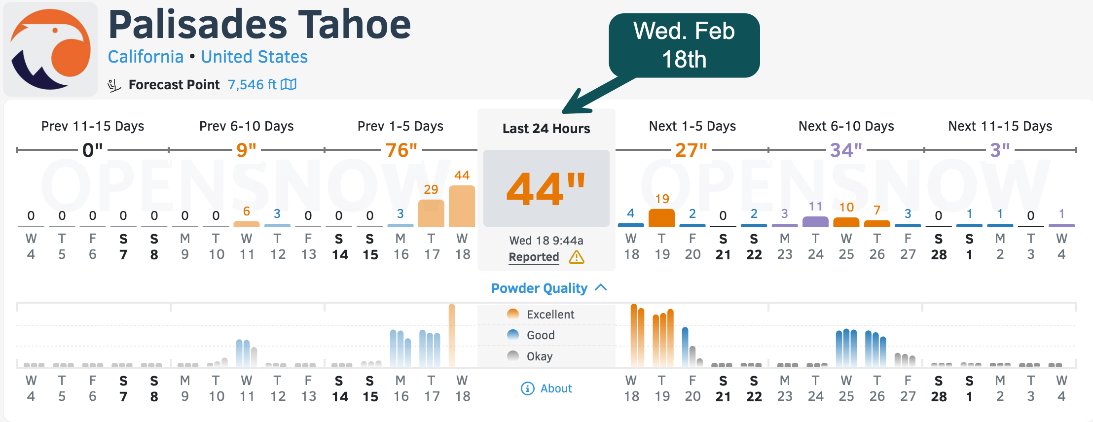 Above is the view from the top of the Far East Express ski lift at Palisades Tahoe this morning at 9:35 PST. The American Discovery Trail passes directly beneath this lift. According to OpenSnow's latest forecast, heavy snow that began falling across the Tahoe region and the Sierra Nevada earlier this week will continue, with two more significant storms rolling through today and Friday (February 18-20). Six feet so far, this week! We're talking about the kind of accumulation that materially changes the spring snowpack picture — exactly the kind of late-winter pattern that extends the melt season and pushes back typical crossing windows.