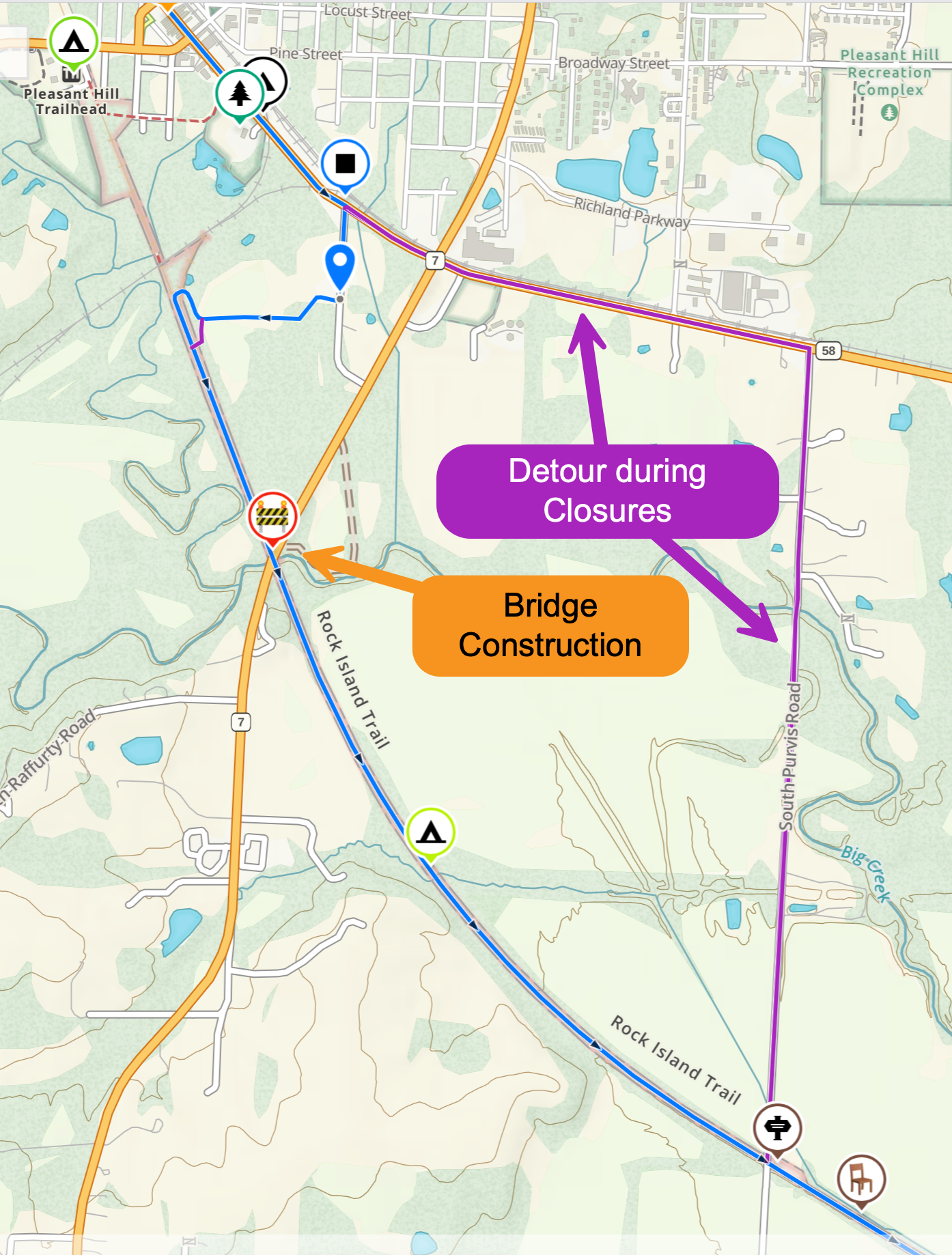 The MO Route 7 bridge over Big Creek is being replaced, and construction running from spring through the end of 2026 will cause intermittent trail closures during demolition and key construction phases. Outside those windows, the trail stays open.
