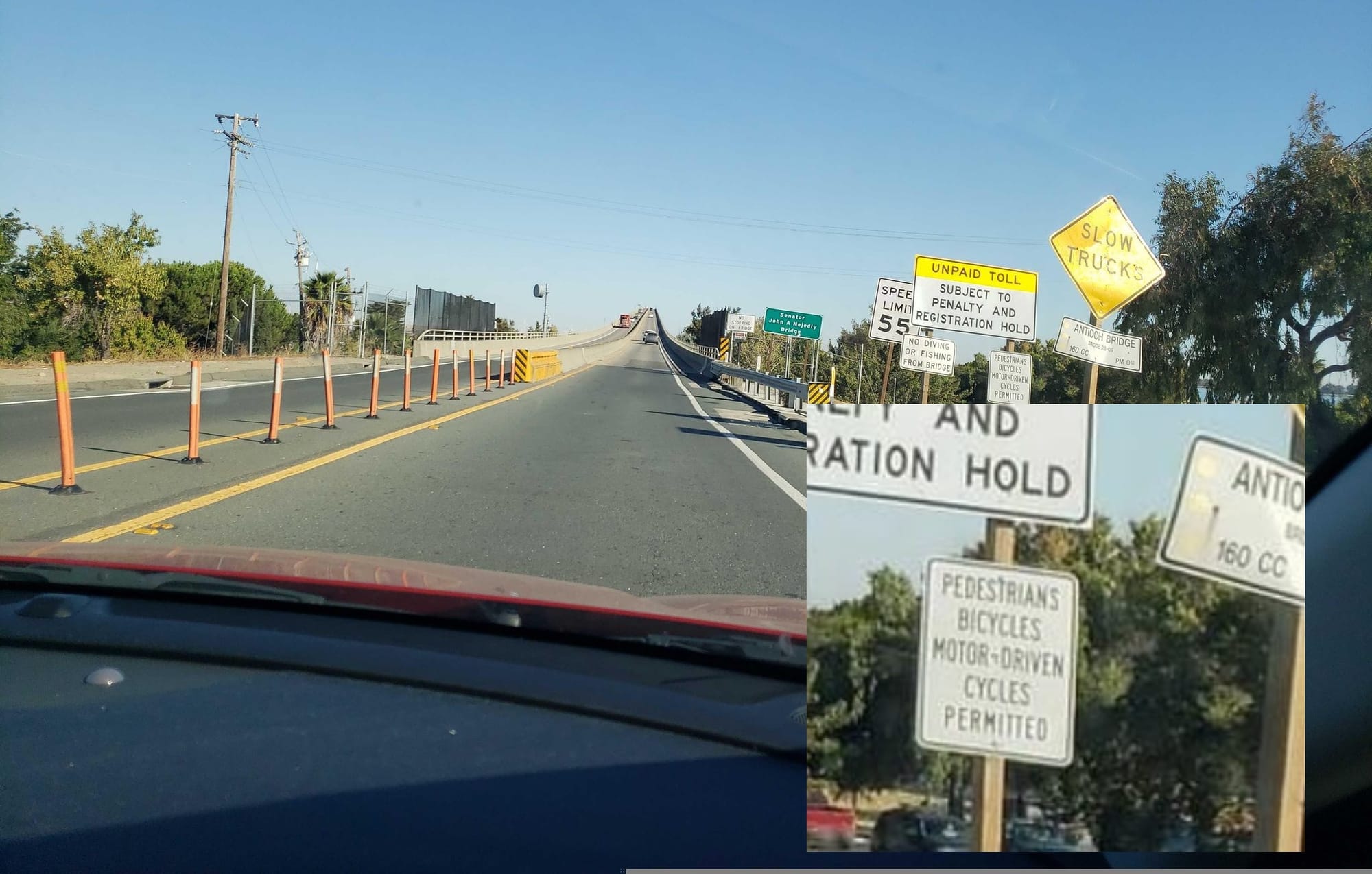 The good news is that rideshare services like Lyft and Uber are alive and well in Antioch, as Marshall discovered. There is a $7.00 toll for southbound vehicles (Sherman Island to Antioch), which will be in addition to the car service fare.