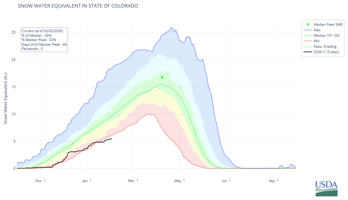 According to the USDA Natural Resources Conservation Service (NRCS), statewide snowpack is currently sitting at just 55% of normal β and in some basins, like the Arkansas River basin, it's as low as 48%. Their February 1st report confirms this isn't a blip β it's a trend that's been building since the water year began on October 1st.