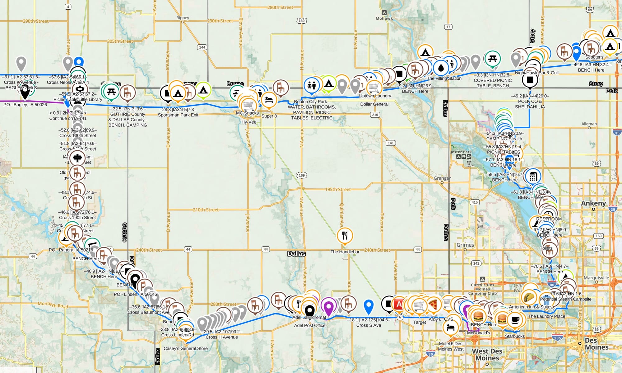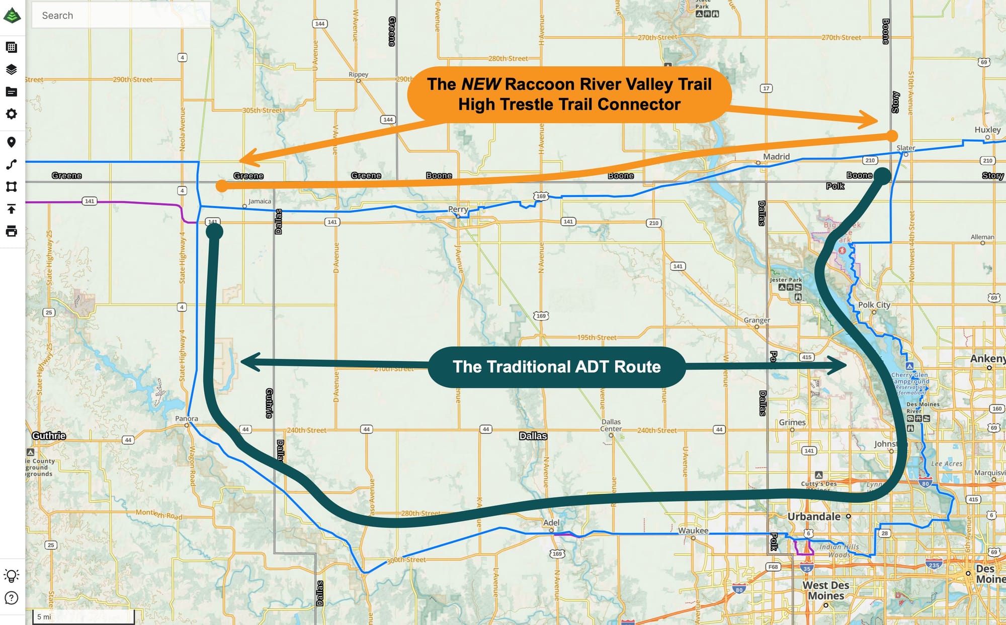 Most ADT hikers follow the traditional southern route through Des Moines, Iowa, which takes them along portions of the Raccoon River Valley Trail and Neal Smith trails. It's efficient, well-marked, and gets you across the state without drama. But when we added the northern High Trestle Trail option to our waypoints when it was completed last year, we knew eventually someone would be curious enough—and have the time—to try the full loop.