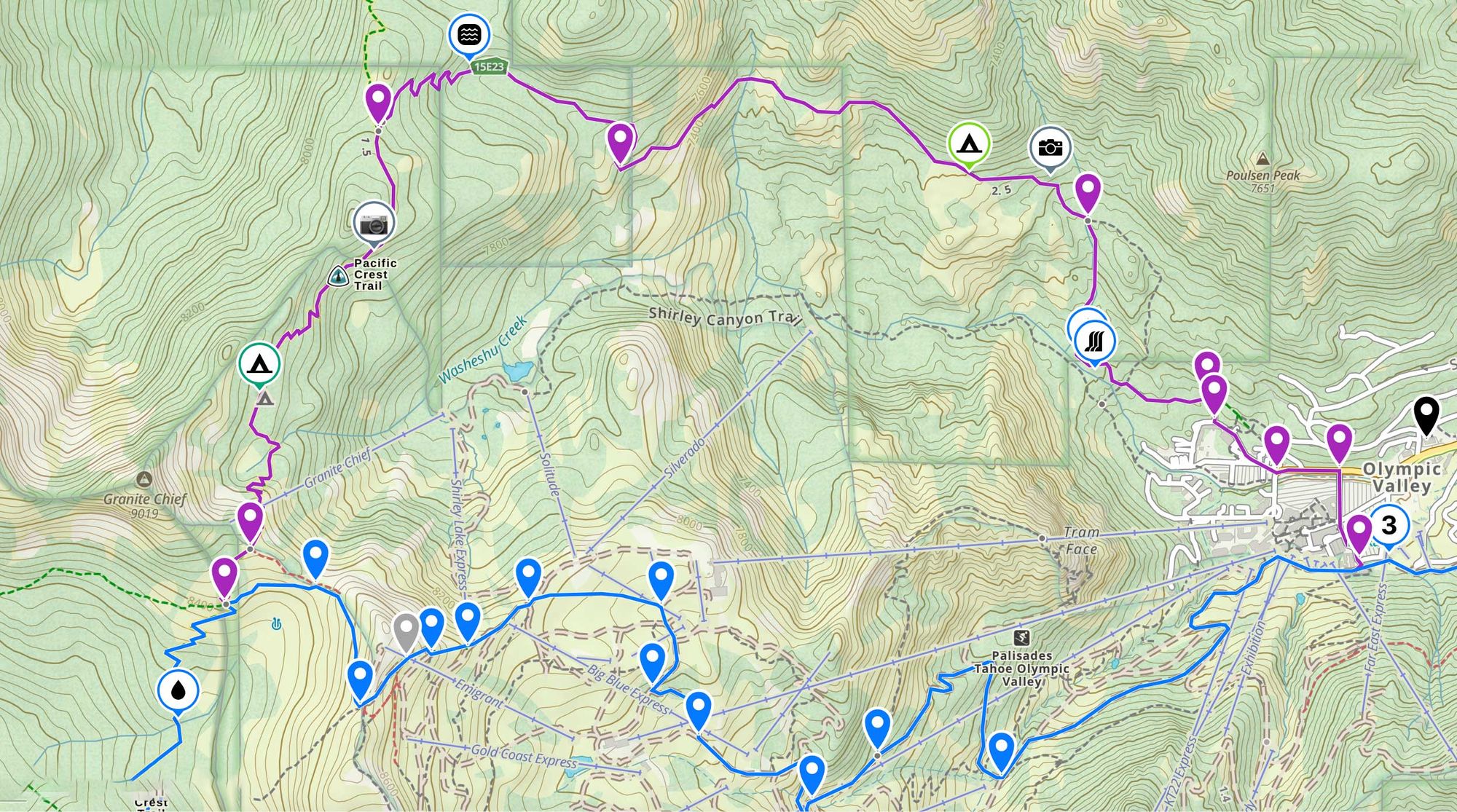 The original ADT route in this area generally uses the Palisades Tahoe ski resort's private service roads up, under, and around ski lifts and lacks water sources except at the bottom of the slopes.
