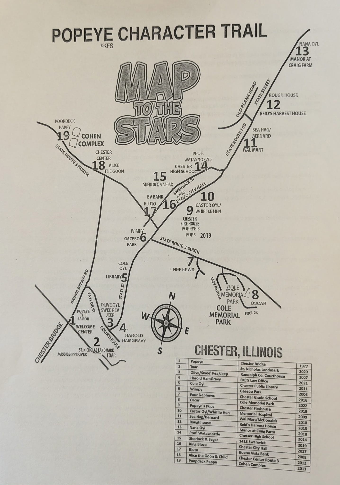 Chester is the hometown of Elzie C. Segar, the creator of Popeye the Sailor Man, and the town embraces that heritage fully. At the Elzie C. Segar Memorial Park, a 6-foot, 900-pound bronze statue of Popeye (above) marks the start of the Chester Character Trail — a walking route through town featuring statues of Popeye characters.